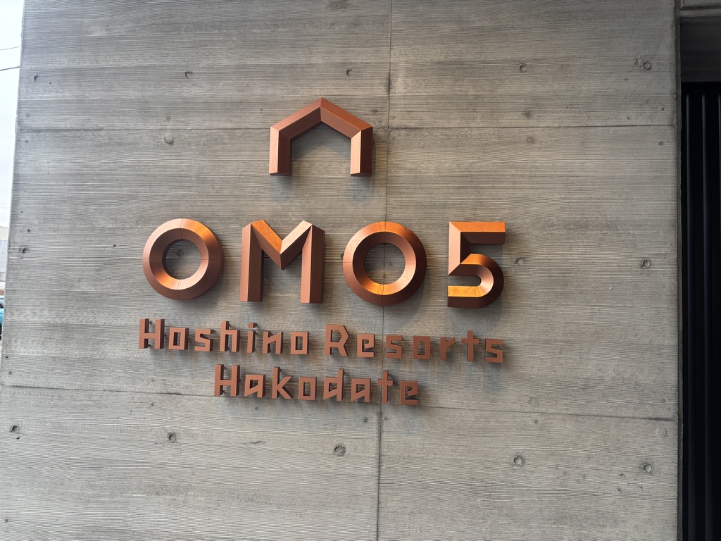 ホテルの入り口には、OMO5函館 by 星野リゾートのロゴが飾ってありました。初めてのOMOブランドへの宿泊、気持ちが高まります♪