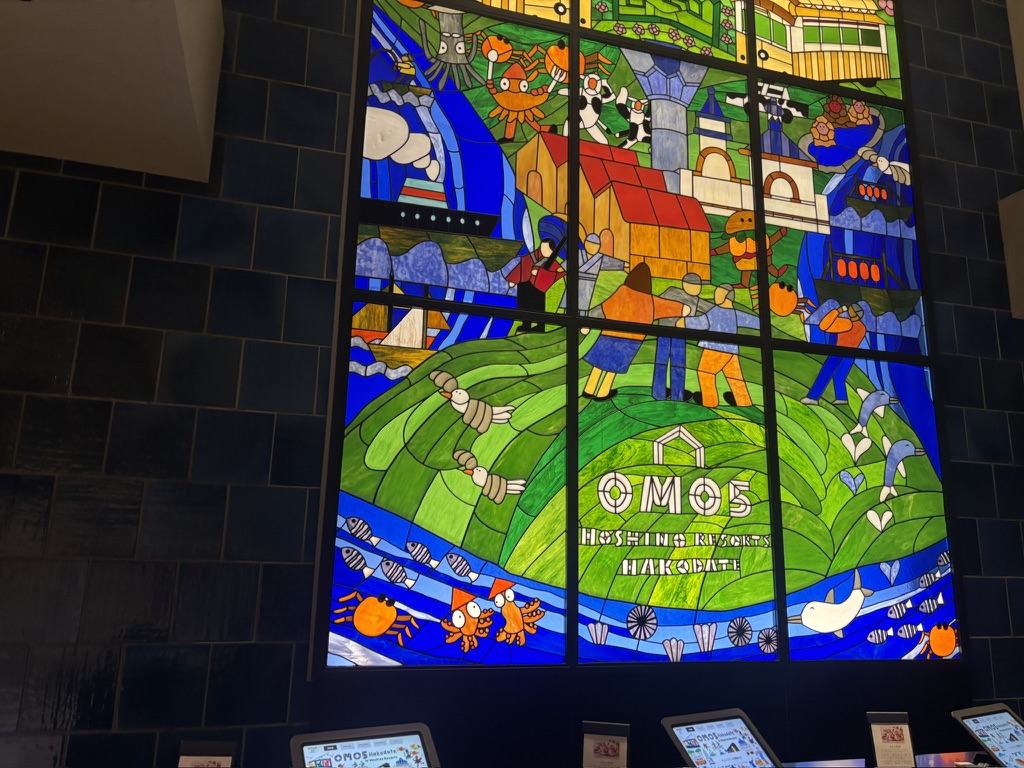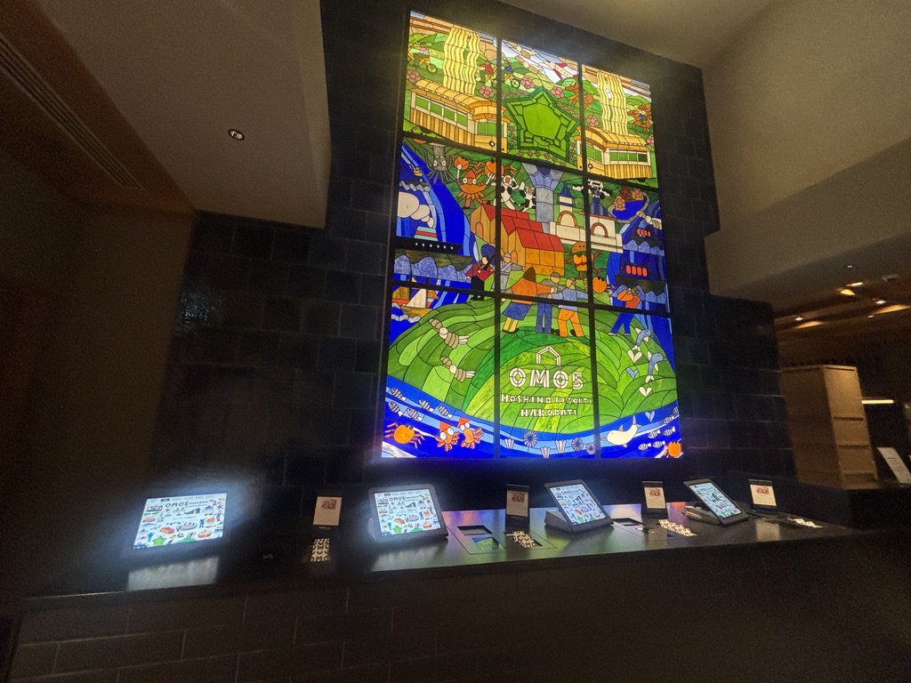 受付のステンドグラスは、そんな函館らしい歴史背景を感じさせるデザインになっています。OMOのモダンな内装と、クラシカルなステンドグラスの組み合わせが絶妙で素敵です♪