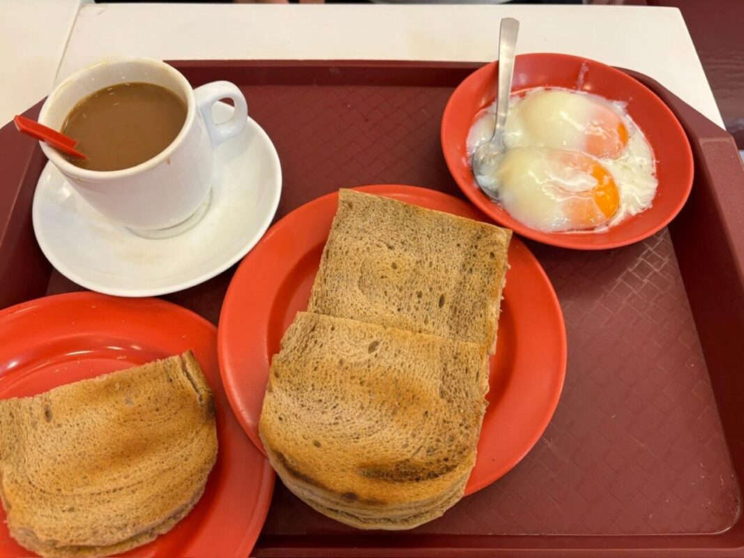 さて、まずは朝ごはんからスタート。シンガポールに来たら、一度はぜひ食べてほしい名物が「カヤトースト」です。カヤトーストとは、カリッと焼いたトーストにカヤジャムとバターを挟んだシンプルなトーストのこと。