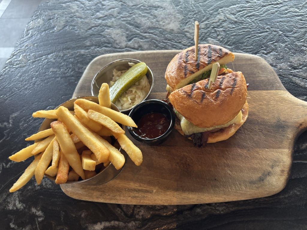 今回チョイスしたのはボリューム満点のバーガー。肉の旨味とソースのバランスが絶妙で、ビールとの相性は言うまでもなく抜群でした。