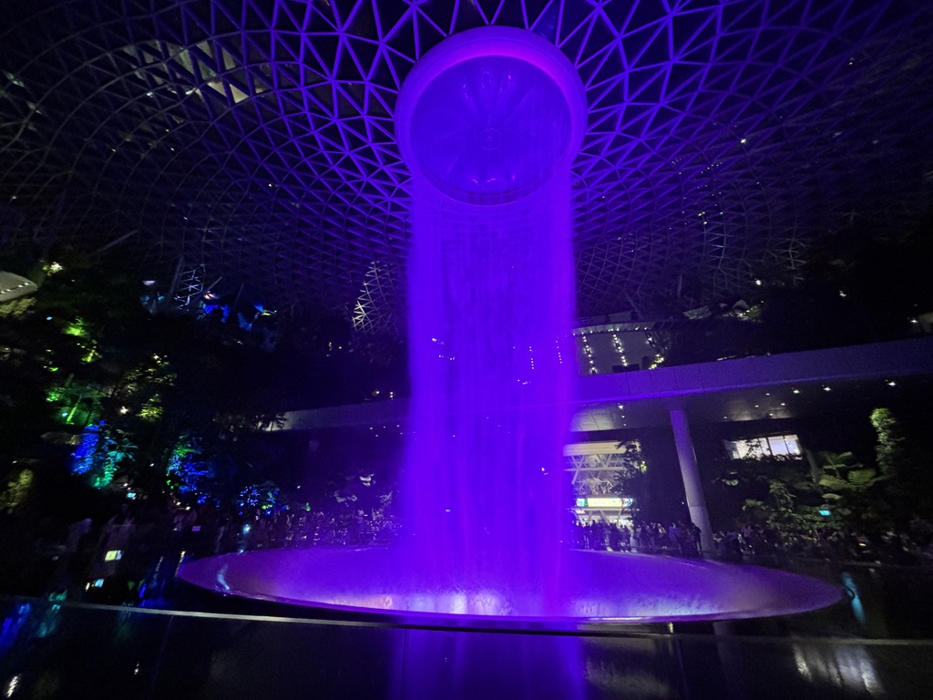 天井から勢いよく流れ落ちる水は圧巻で、昼間は自然光に照らされて爽やかに、夜はライトアップによって幻想的な空間に変わります。この光景、空港の中だということを忘れてしまいます。